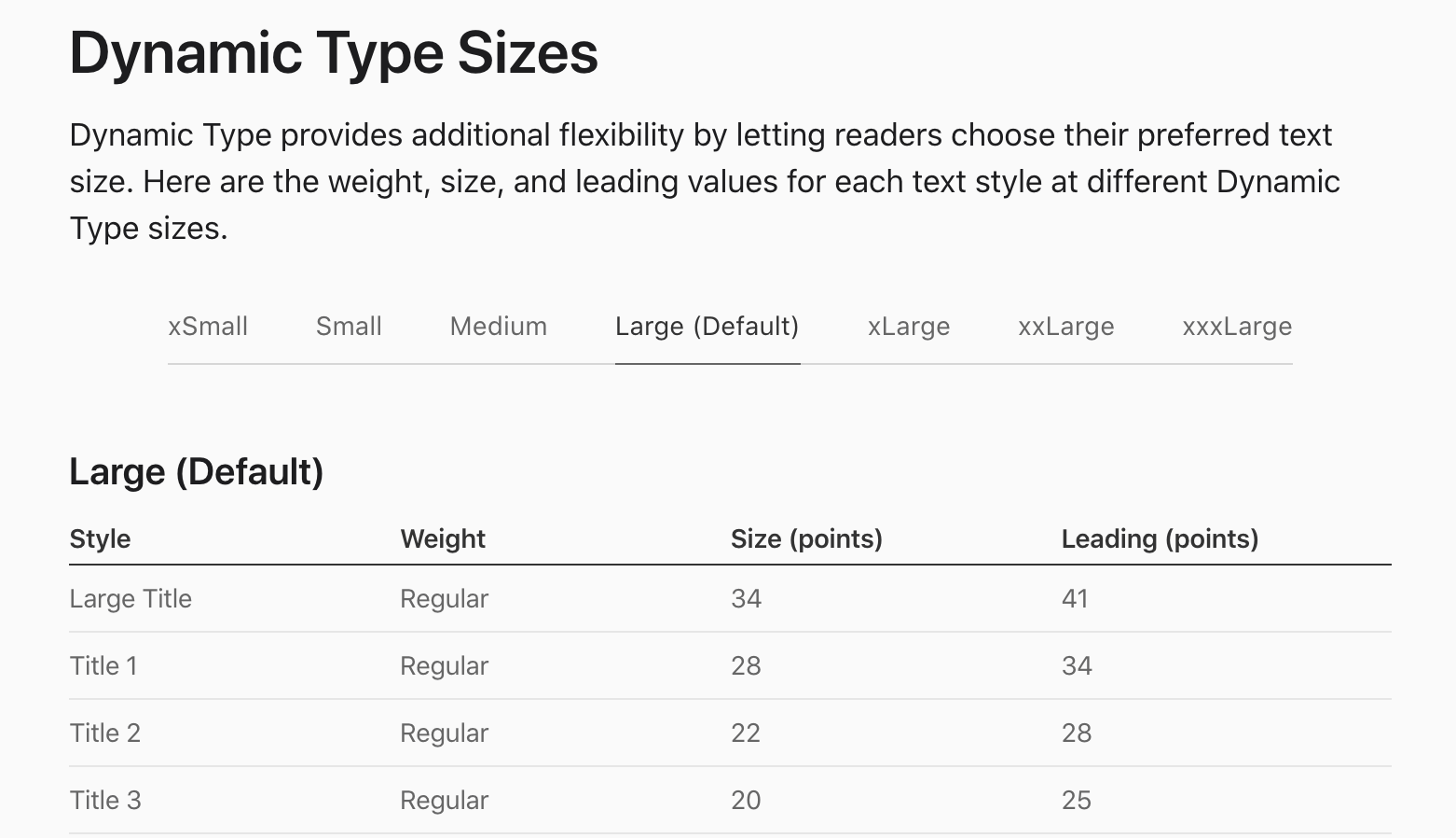 Apple’s Human Interface Guidelines typographic size table